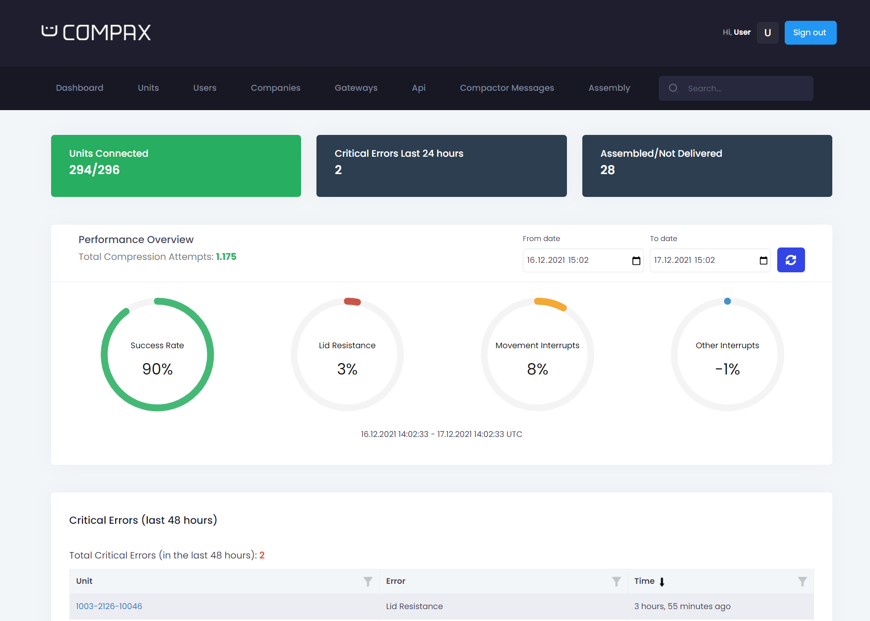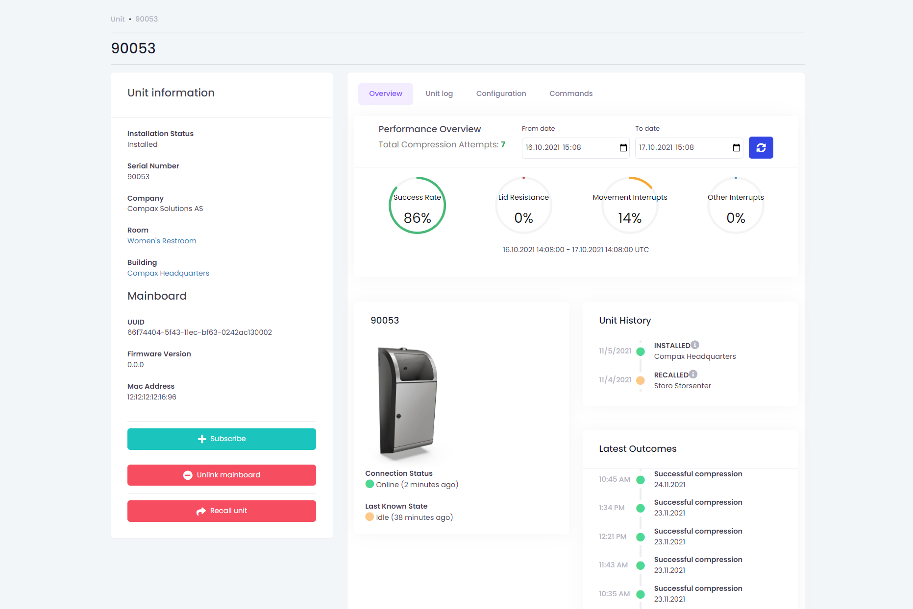 Vi har utviklet et komplett system for styring og monitorering av Compax Solutions sine smarte avfallsbeholdere. Admin-dashboardet gir Compax full oversikt over data fra komprimatorenes mange sensorer, og har toveiskommunikasjon for å sende kommandoer og endre innstillinger. I tillegg kan Compax sine kunder se fullhets- og aktivitetsnivå for sine avfallsbeholdere i en egen kundeportal.